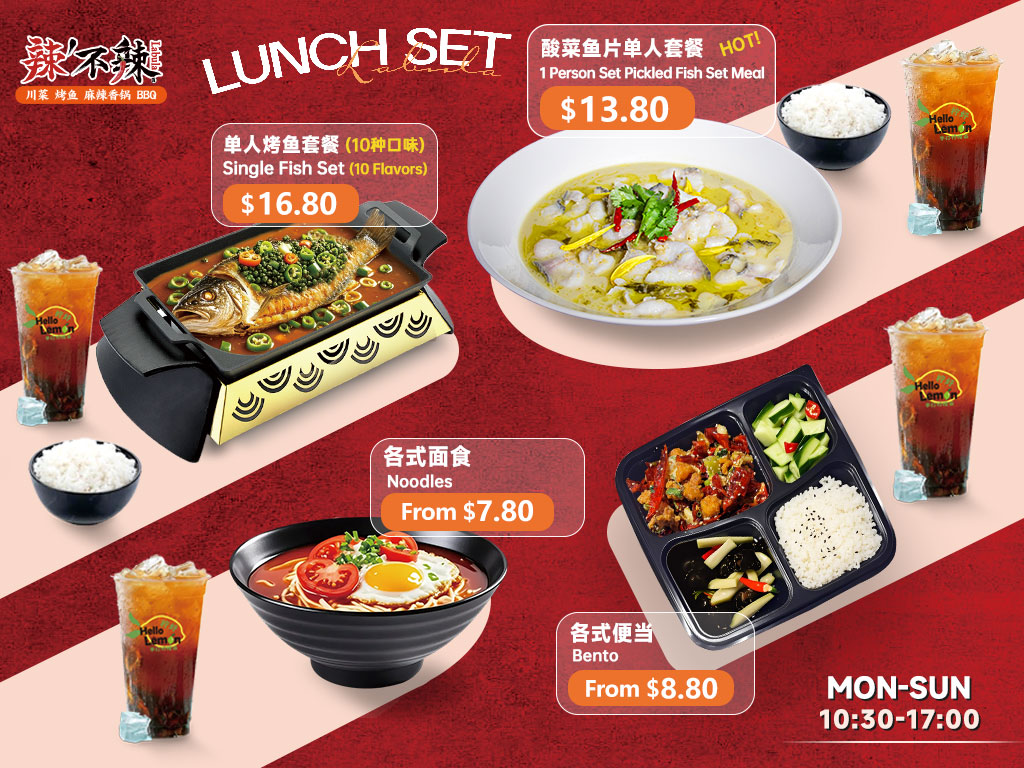 辣不辣推出超值午市套餐,让你在轻松午休时刻也能享受地道川味:酸菜鱼片套餐 — $13.80;单人烤鱼套餐(10种口味任选)— $16.80;各式面食 — From $7.80;精选便当 — From $8.80。